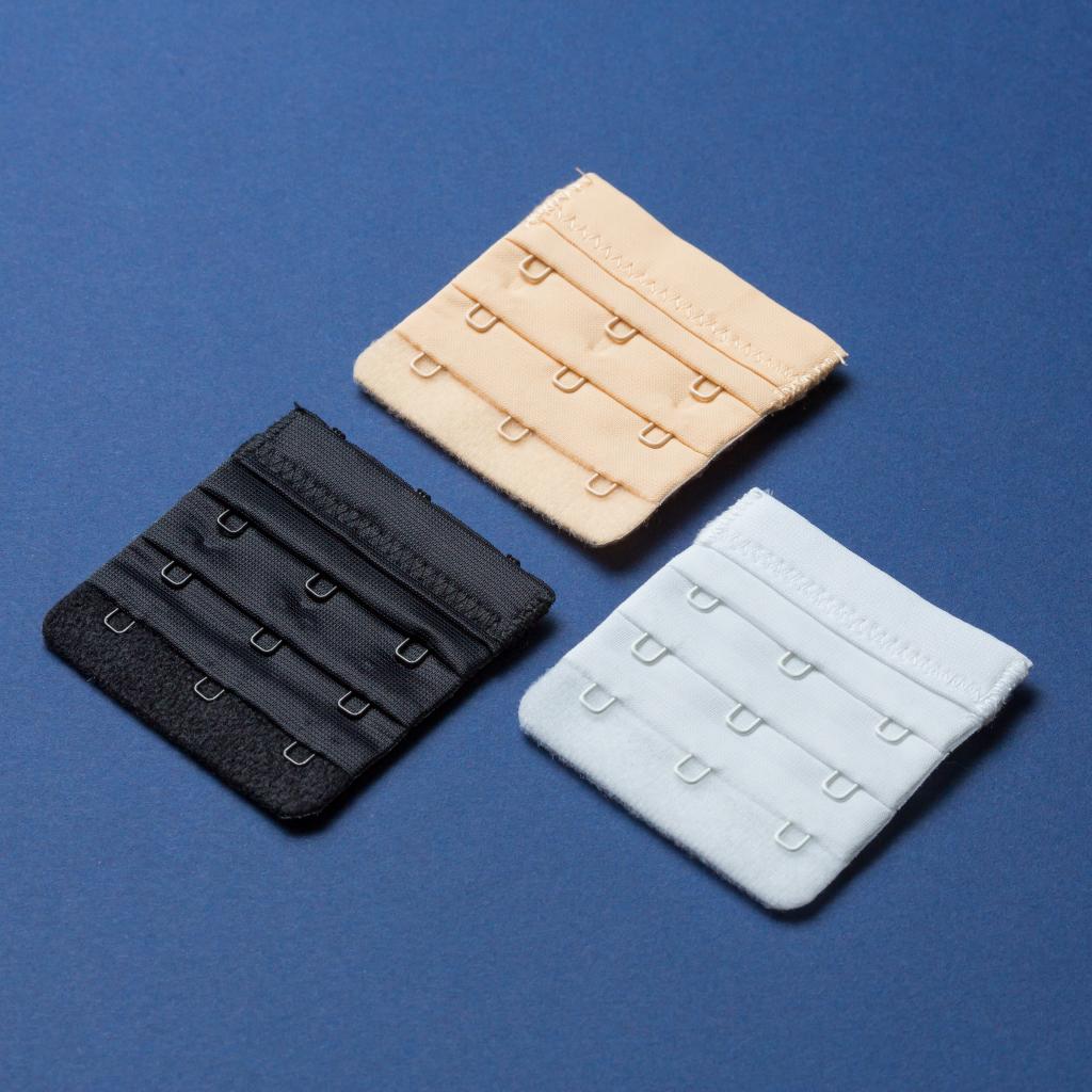 Набор из 3 разноцветных удлинителей для бюстгальтера шириной в 3 крючка: белого, черного и телесного цвета.