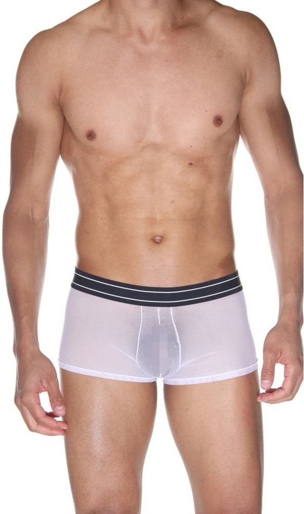 Боксеры для мужчин из белой полупрозрачной эластичной ткани, на широкой черной резинке с двумя белыми полосами.