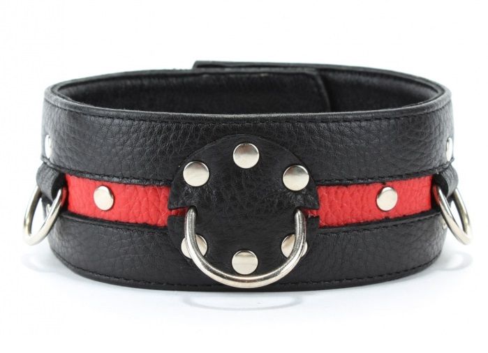 Стильный ошейник с красной полосой и металлическими заклепками обязательно понравится любителям БДСМ-игр. К пряжке можно пристегнуть поводок или наручники.