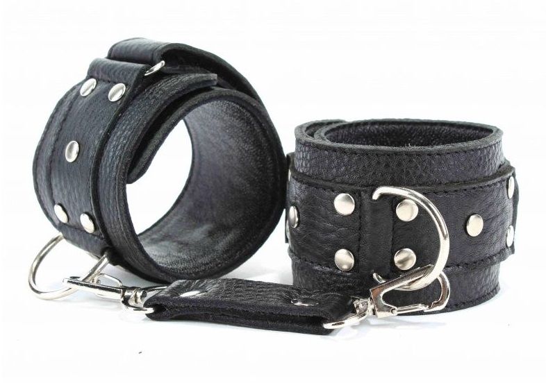 Кожаные наручники черного цвета. Украшены заклепками и соединяются между собой цепью с карабинами. Размер наручников регулируется при помощи застежки-липучки Ширина - 5 см. Длина цепочки - 15,5 см.